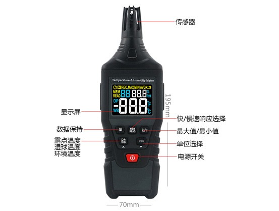 溫濕度儀是一款使用電池供電,高精度溫濕度傳感器,用于測量相對濕度和溫度的儀表;還可顯示濕球溫度和露點溫度。也是一款用于測量溫度及水分在大氣中的含量??焖?、方便、精確的測量空氣中的濕度和溫度讀數。濕度測量通常依靠如溫度、壓力測量、質量、機械或電氣變化的物質中的水分吸收量來測量濕度,再通過校驗和計算來獲取濕度測量數據。電子設備中使用電變化電容或電阻測量濕度的差異。應用于實驗設備、工業(yè)、工程生產和專業(yè)用途等行業(yè)。